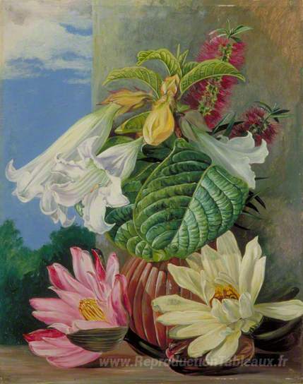 Nous vous proposons une reproduction artisanale sur toile du célèbre tableau 'Fleurs cultivées dans le jardin botanique, Rio Janeiro, Brésil' de Marianne North, provenant du Musée de la Reproduction.