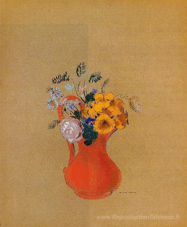 Nous vous proposons une reproduction artisanale sur toile du célèbre tableau 'Fleurs dans un pichet rouge' de Odilon Redon, provenant du Musée de la Reproduction.