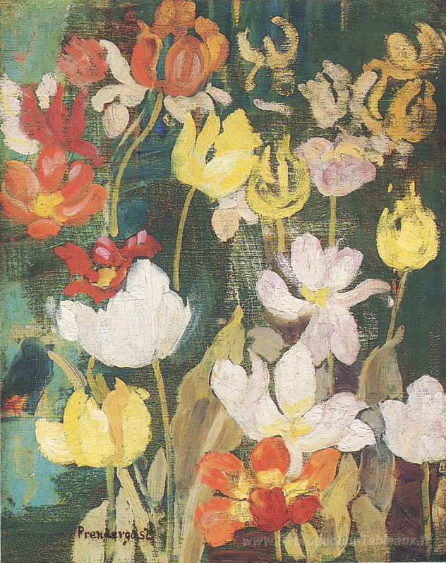 Nous vous proposons une reproduction artisanale sur toile du célèbre tableau 'Fleurs de printemps' de Maurice Prendergast, provenant du Musée de la Reproduction.