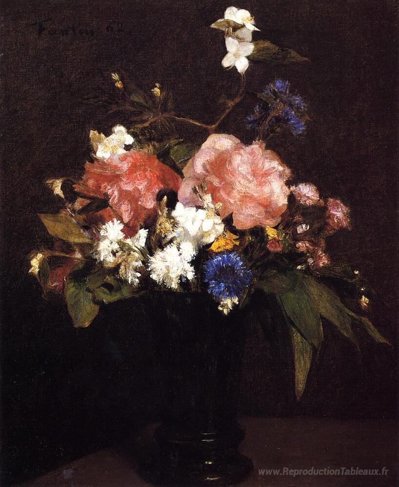 Nous vous proposons une reproduction artisanale sur toile du célèbre tableau 'Fleurs' de Henri Fantin-Latour, provenant du Musée de la Reproduction.