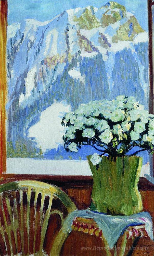 Nous vous proposons une reproduction artisanale sur toile du célèbre tableau 'Fleurs sur le balcon' de Boris Kustodiev, provenant du Musée de la Reproduction.