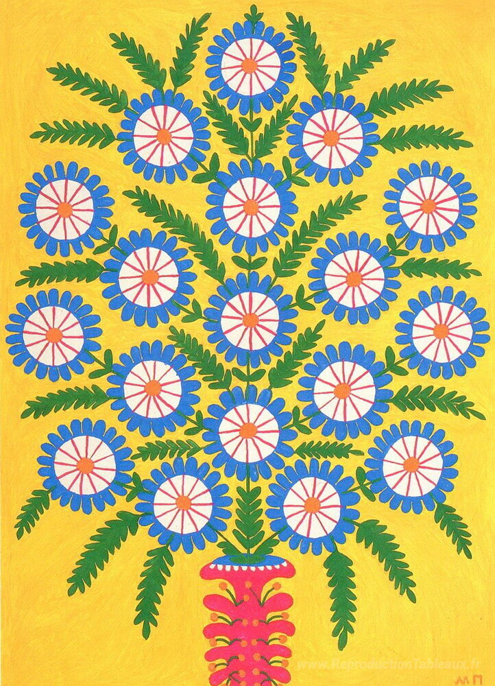 Découvrez l'univers enchanteur de Maria Primachenko, une artiste emblématique du mouvement folk ukrainien, à travers sa fascinante œuvre Je donne mes petites étoiles aux enfants. Ce chef-d'œuvre à l'huile se distingue par ses couleurs vives et ses motifs narratifs, transportant l'observateur dans un monde onirique où la magie et la réalité se mélangent. Les techniques picturales de Primachenko, basées sur un profond respect des traditions populaires, révèlent une maîtrise remarquable qui captive les amateurs d'art depuis des générations.