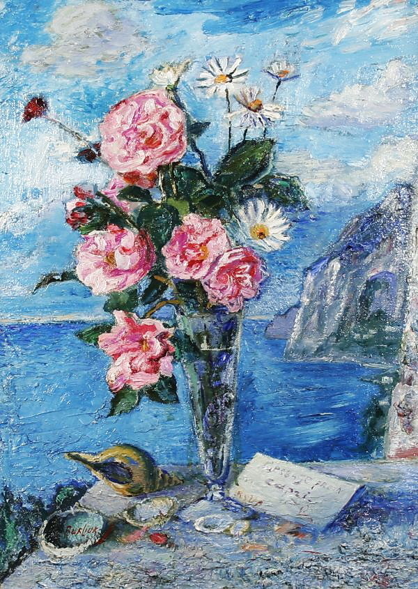 Nous vous proposons une reproduction artisanale sur toile du célèbre tableau 'Message de Capri' de David Burliuk, provenant du Musée de la Reproduction.