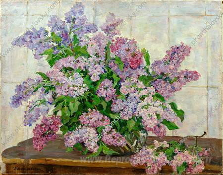 Nous vous proposons une reproduction artisanale sur toile du célèbre tableau 'Nature morte. Lilas contre le poêle.' de Pyotr Konchalovsky, provenant du Musée de la Reproduction.