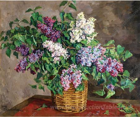 Nous vous proposons une reproduction artisanale sur toile du célèbre tableau 'Nature morte. Lilas dans un panier.' de Pyotr Konchalovsky, provenant du Musée de la Reproduction.