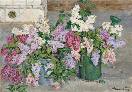 Nous vous proposons une reproduction artisanale sur toile du célèbre tableau 'Nature morte. Lilas, un seau et une boîte d'arrosage.' de Pyotr Konchalovsky, provenant du Musée de la Reproduction.