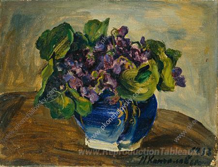 Nous vous proposons une reproduction artisanale sur toile du célèbre tableau 'Nature morte. Parme Violets.' de Pyotr Konchalovsky, provenant du Musée de la Reproduction.
