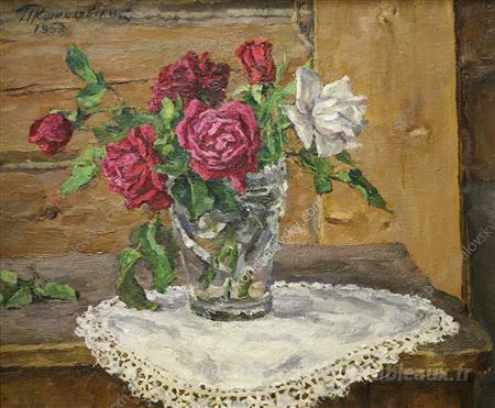 Nous vous proposons une reproduction artisanale sur toile du célèbre tableau 'Nature morte. Roses sur un fond jaune.' de Pyotr Konchalovsky, provenant du Musée de la Reproduction.