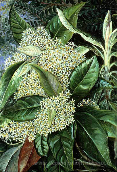 Nous vous proposons une reproduction artisanale sur toile du célèbre tableau 'Olearia argophylla' de Marianne North, provenant du Musée de la Reproduction.