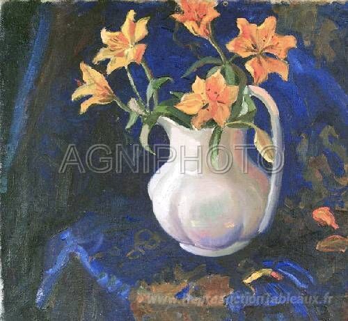 Nous vous proposons une reproduction artisanale sur toile du célèbre tableau 'Pichet avec des fleurs' de Ilya Mashkov, provenant du Musée de la Reproduction.