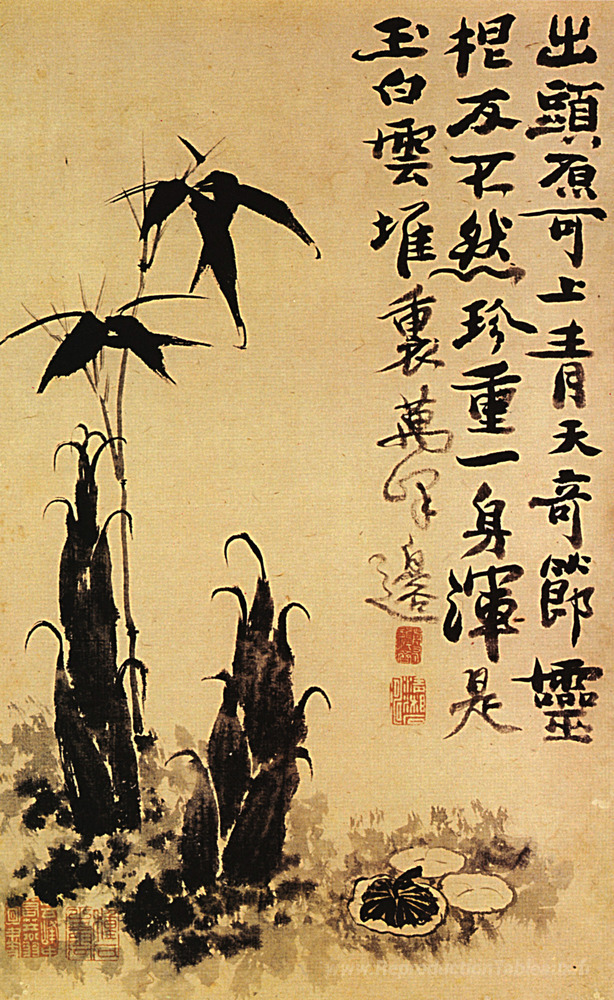 Nous vous proposons une reproduction artisanale sur toile du célèbre tableau 'Pousses de bambou' de Shitao, provenant du Musée de la Reproduction.