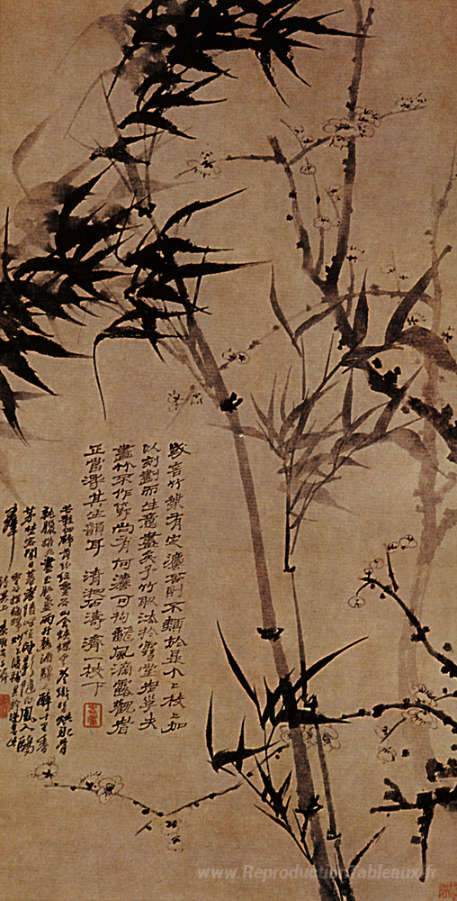 Nous vous proposons une reproduction artisanale sur toile du célèbre tableau 'Prunus en fleur et bambou' de Shitao, provenant du Musée de la Reproduction.
