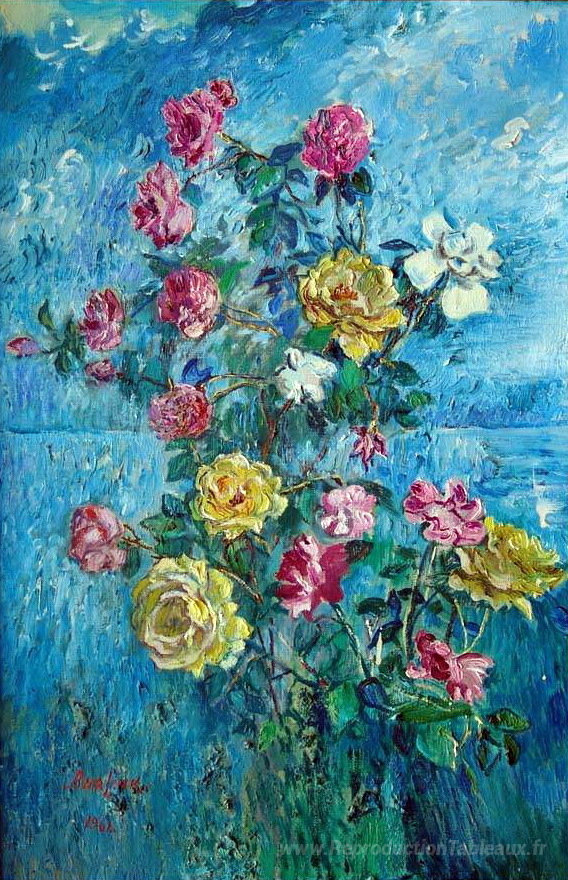 Nous vous proposons une reproduction artisanale sur toile du célèbre tableau 'Roses avec fond bleu' de David Burliuk, provenant du Musée de la Reproduction.