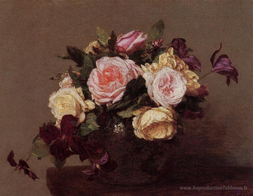 Nous vous proposons une reproduction artisanale sur toile du célèbre tableau 'Roses et Clematis' de Henri Fantin-Latour, provenant du Musée de la Reproduction.