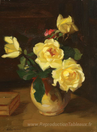 Nous vous proposons une reproduction artisanale sur toile du célèbre tableau 'Roses jaunes' de Constantin Artachino, provenant du Musée de la Reproduction.