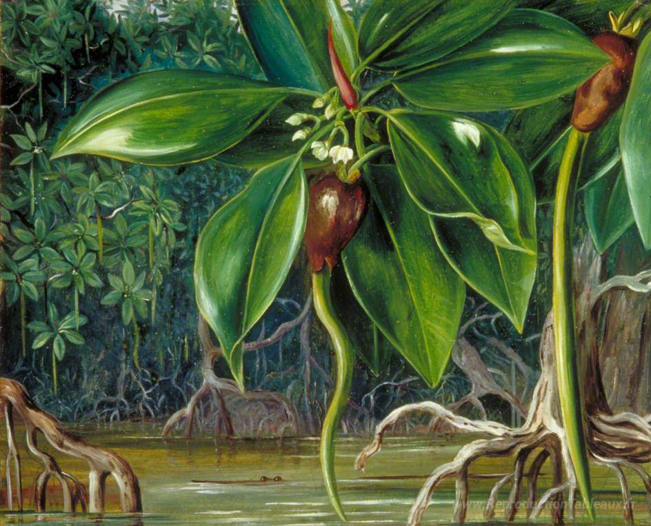 Nous vous proposons une reproduction artisanale sur toile du célèbre tableau 'Un marais de mangrove à Sarawak, Bornéo' de Marianne North, provenant du Musée de la Reproduction.