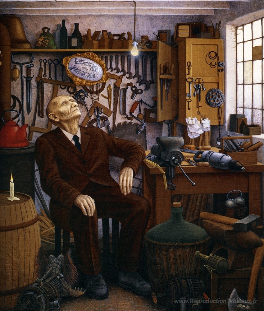Nous vous proposons une reproduction artisanale sur toile du célèbre tableau 'À chacun ses goûts' de Jacek Yerka, provenant du Musée de la Reproduction.
