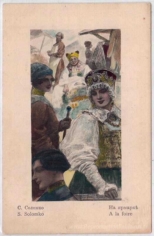Nous vous proposons une reproduction artisanale sur toile du célèbre tableau 'À la foire' de Sergey Solomko, provenant du Musée de la Reproduction.