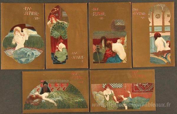 Nous vous proposons une reproduction artisanale sur toile du célèbre tableau 'À SERAL' de Raphael Kirchner, provenant du Musée de la Reproduction.