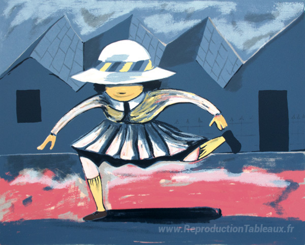 Nous vous proposons une reproduction artisanale sur toile du célèbre tableau 'Écolière sautant' de Charles Blackman, provenant du Musée de la Reproduction.