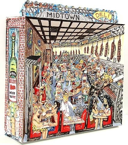 Nous vous proposons une reproduction artisanale sur toile du célèbre tableau 'épicerie fine' de Red Grooms, provenant du Musée de la Reproduction.