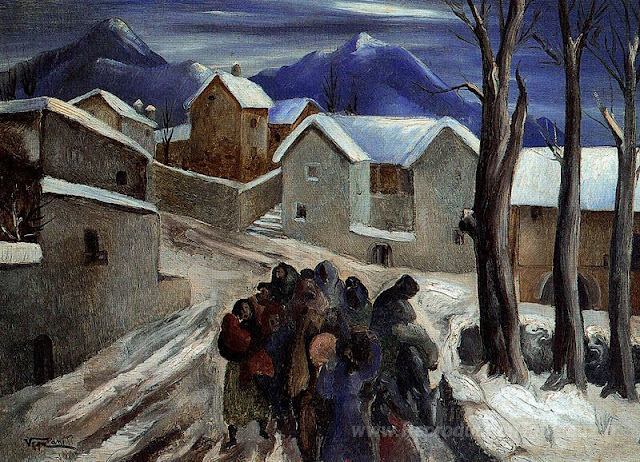 Nous vous proposons une reproduction artisanale sur toile du célèbre tableau 'Évacuation des pyrénées' de Vela Zanetti, provenant du Musée de la Reproduction.