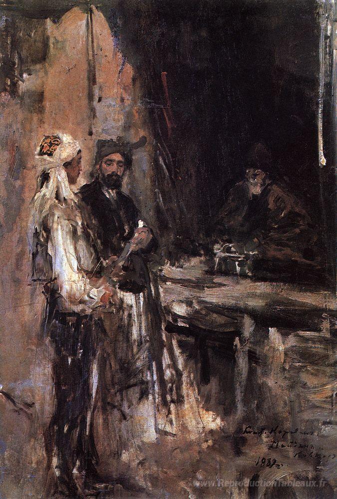 Nous vous proposons une reproduction artisanale sur toile du célèbre tableau 'Acheter un poignard' de Konstantin Korovin, provenant du Musée de la Reproduction.