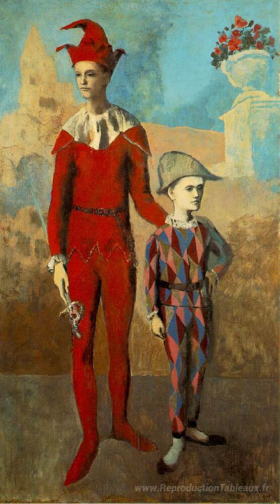 Nous vous proposons une reproduction artisanale sur toile du célèbre tableau 'Acrobate et jeune harlequin' de Pablo Picasso, provenant du Musée de la Reproduction.