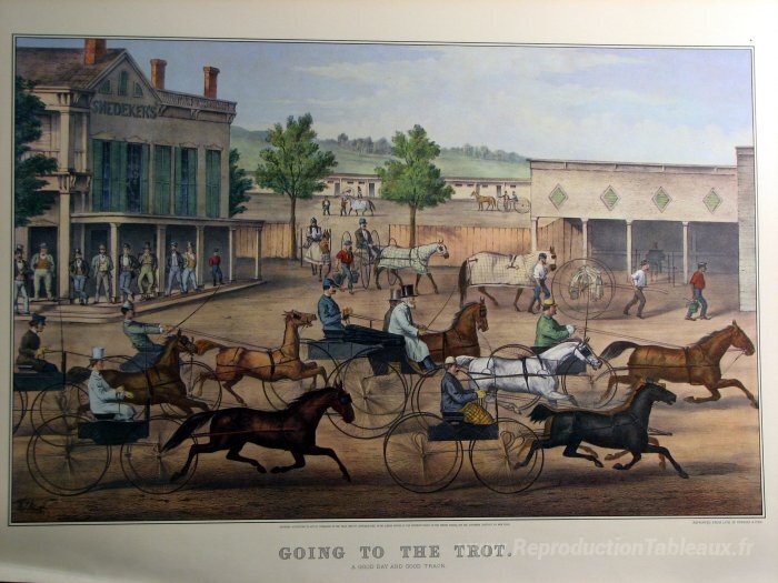 Nous vous proposons une reproduction artisanale sur toile du célèbre tableau 'Aller au trot' de Currier and Ives, provenant du Musée de la Reproduction.