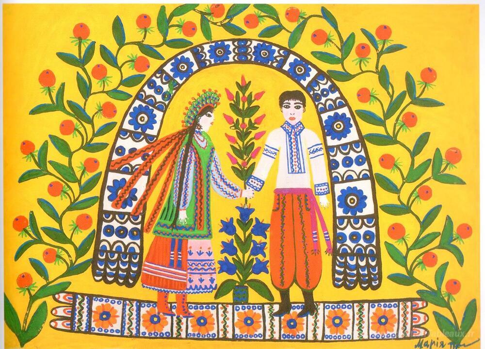 Nous vous proposons une reproduction artisanale sur toile du célèbre tableau 'Allons-nous à la fête des fiançailles' de Maria Primachenko, provenant du Musée de la Reproduction.