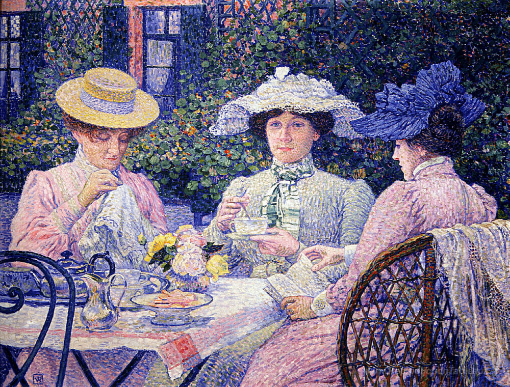 Nous vous proposons une reproduction artisanale sur toile du célèbre tableau 'Après-midi d'été (thé dans le jardin)' de Theo van Rysselberghe, provenant du Musée de la Reproduction.
