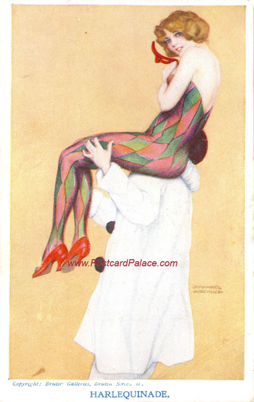 Nous vous proposons une reproduction artisanale sur toile du célèbre tableau 'Arlequinade' de Raphael Kirchner, provenant du Musée de la Reproduction.