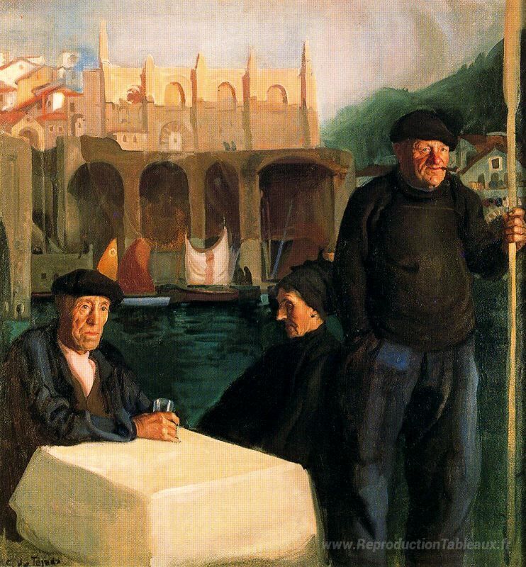Nous vous proposons une reproduction artisanale sur toile du célèbre tableau 'Arrantzales. Ondárroa.' de Carlos Saenz de Tejada, provenant du Musée de la Reproduction.