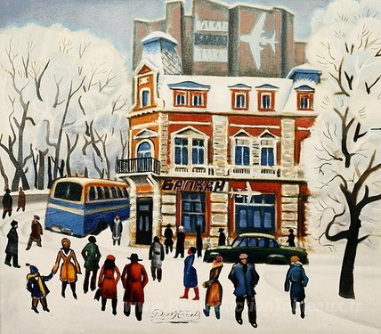 Nous vous proposons une reproduction artisanale sur toile du célèbre tableau 'Arrivée' de Radi Nedelchev, provenant du Musée de la Reproduction.