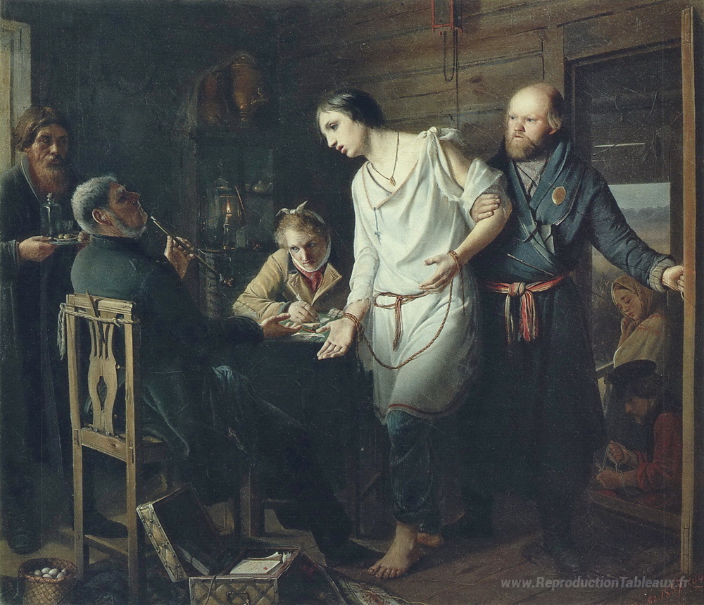 Nous vous proposons une reproduction artisanale sur toile du célèbre tableau 'Arriver à une enquête' de Vasily Perov, provenant du Musée de la Reproduction.