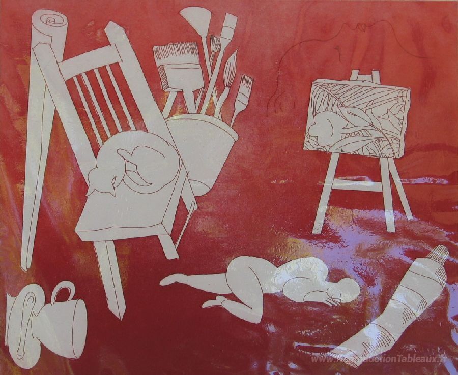 Nous vous proposons une reproduction artisanale sur toile du célèbre tableau 'Atelier Rouge' de Charles Blackman, provenant du Musée de la Reproduction.
