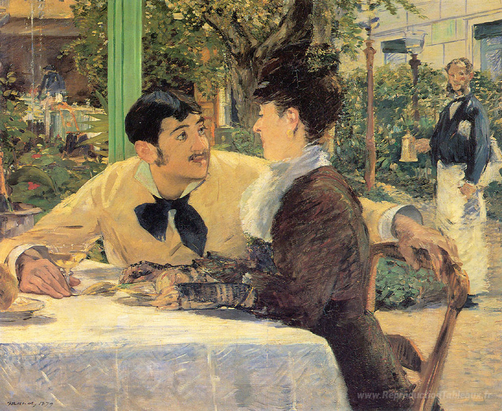 Nous vous proposons une reproduction artisanale sur toile du célèbre tableau 'Au père Lathuille' de Edouard Manet, provenant du Musée de la Reproduction.