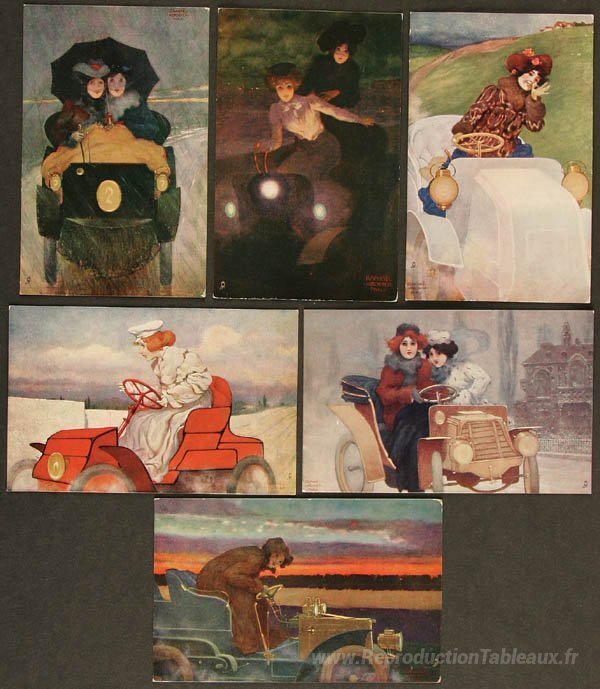Nous vous proposons une reproduction artisanale sur toile du célèbre tableau 'Automobilistes clignotants' de Raphael Kirchner, provenant du Musée de la Reproduction.