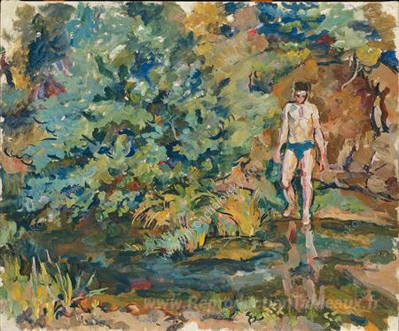 Nous vous proposons une reproduction artisanale sur toile du célèbre tableau 'Baignade' de Pyotr Konchalovsky, provenant du Musée de la Reproduction.