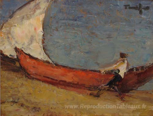 Nous vous proposons une reproduction artisanale sur toile du célèbre tableau 'Bateau de pêcheur en mer' de Nicolae Tonitza, provenant du Musée de la Reproduction.