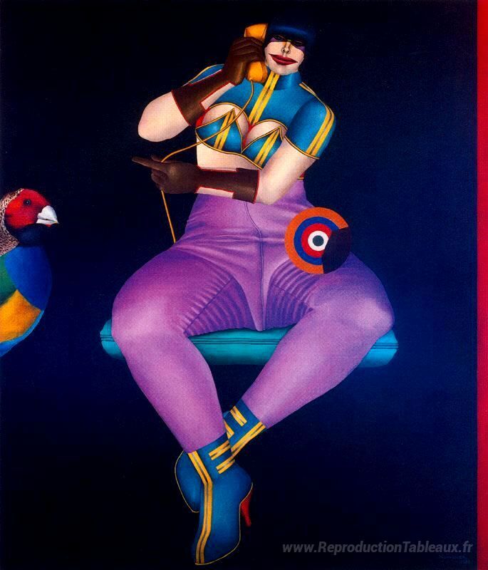 Nous vous proposons une reproduction artisanale sur toile du célèbre tableau 'Bonjour' de Richard Lindner, provenant du Musée de la Reproduction.