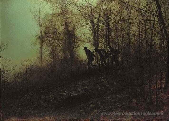 Nous vous proposons une reproduction artisanale sur toile du célèbre tableau 'Braconniers' de John Atkinson Grimshaw, provenant du Musée de la Reproduction.