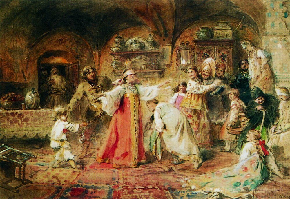 Nous vous proposons une reproduction artisanale sur toile du célèbre tableau 'Cache-cache' de Konstantin Makovsky, provenant du Musée de la Reproduction.