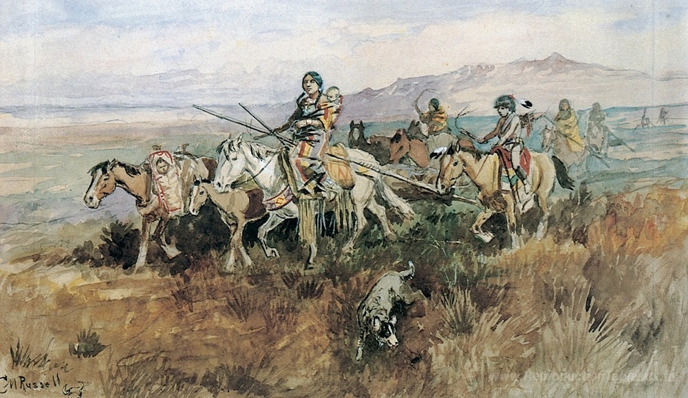 Nous vous proposons une reproduction artisanale sur toile du célèbre tableau 'Camp de déménagement indien avec Travois' de Charles M. Russell, provenant du Musée de la Reproduction.
