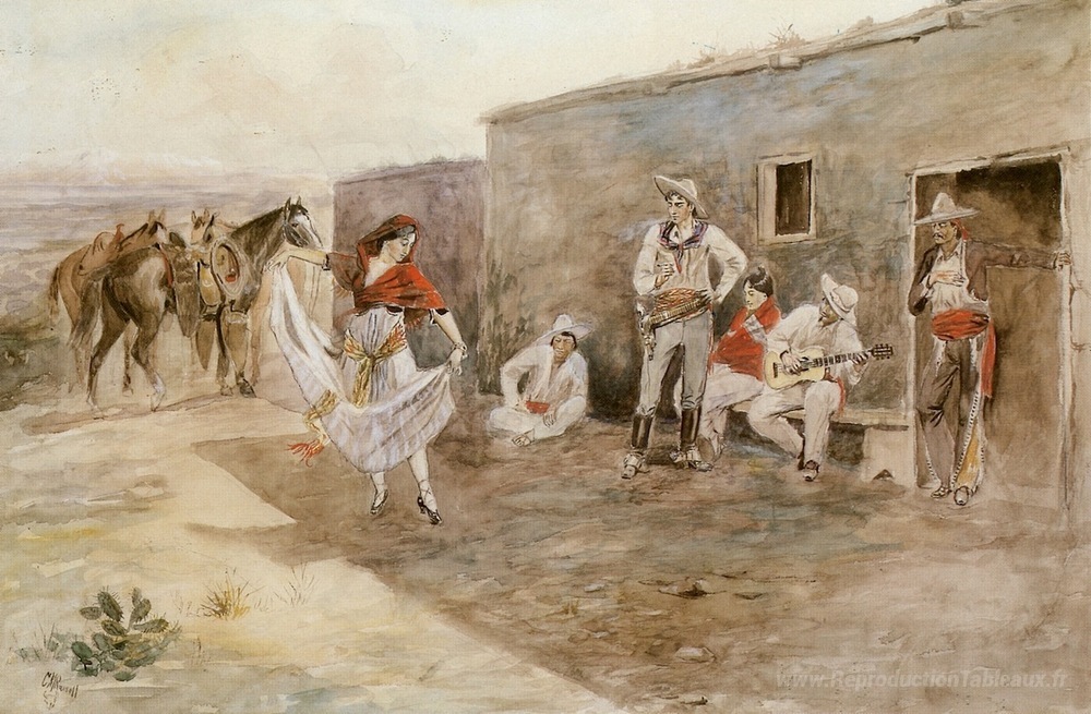 Nous vous proposons une reproduction artisanale sur toile du célèbre tableau 'Casa Alegre' de Charles M. Russell, provenant du Musée de la Reproduction.