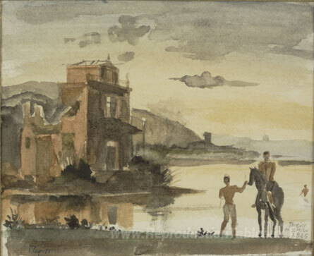 Nous vous proposons une reproduction artisanale sur toile du célèbre tableau 'Cavalier et bêtère avec maison' de Yiannis Tsaroychis, provenant du Musée de la Reproduction.