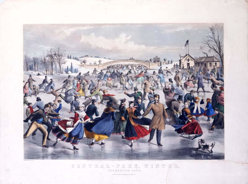 Nous vous proposons une reproduction artisanale sur toile du célèbre tableau 'Central Park, hiver. L'étang de patinage' de Currier and Ives, provenant du Musée de la Reproduction.