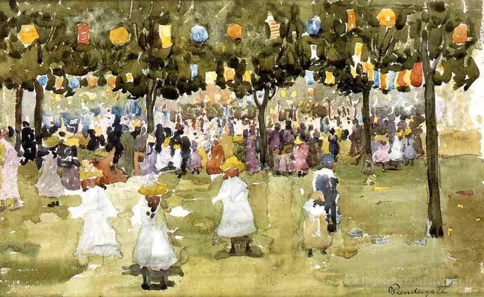 Nous vous proposons une reproduction artisanale sur toile du célèbre tableau 'Central Park, New York City, 4 juillet' de Maurice Prendergast, provenant du Musée de la Reproduction.