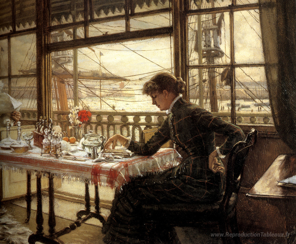 Nous vous proposons une reproduction artisanale sur toile du célèbre tableau 'Chambre surplombant le port' de James Tissot, provenant du Musée de la Reproduction.