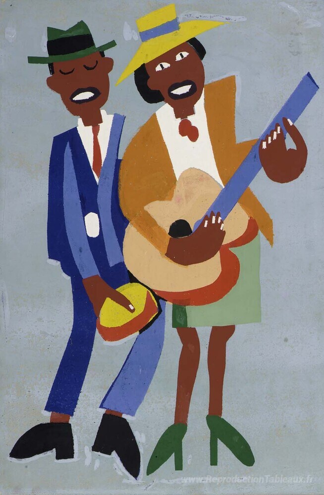 Nous vous proposons une reproduction artisanale sur toile du célèbre tableau 'Chanteur aveugle (musiciens de rue)' de William H. Johnson, provenant du Musée de la Reproduction.